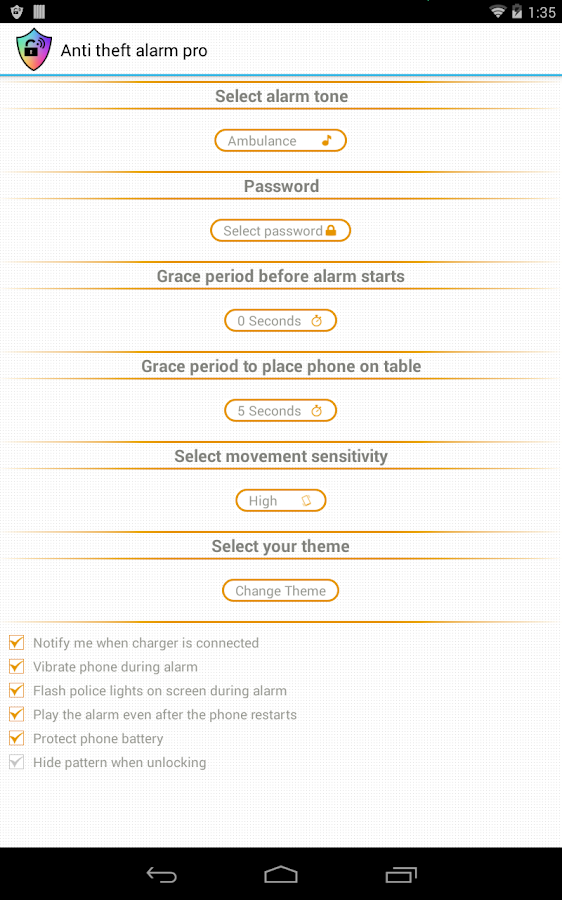 يمكنك تشغيل البرنامج ووضعه في أي مكان وعند تحريكه يطلق صافرة انظار ( يوجد بالبرنامج مجموعة من صافرات الانذار للبوليس والاسعاف وغيرها ) وأيضا يمكنك من أختيار باسورد لايقاف صوت التحذير وأيضا تشغيلة أثناء الشحن فيحميك من خلع أي شخص للشاحن عند شحن جهازك